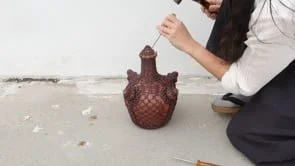 Using the traditional kendi vessel as a mould, lace was crocheted around it in nylon, and then torched to transform it into a hard yet brittle exoskeleton. The ceramic vessel inside was then cracked apart, leaving behind only a ghost of what was before.