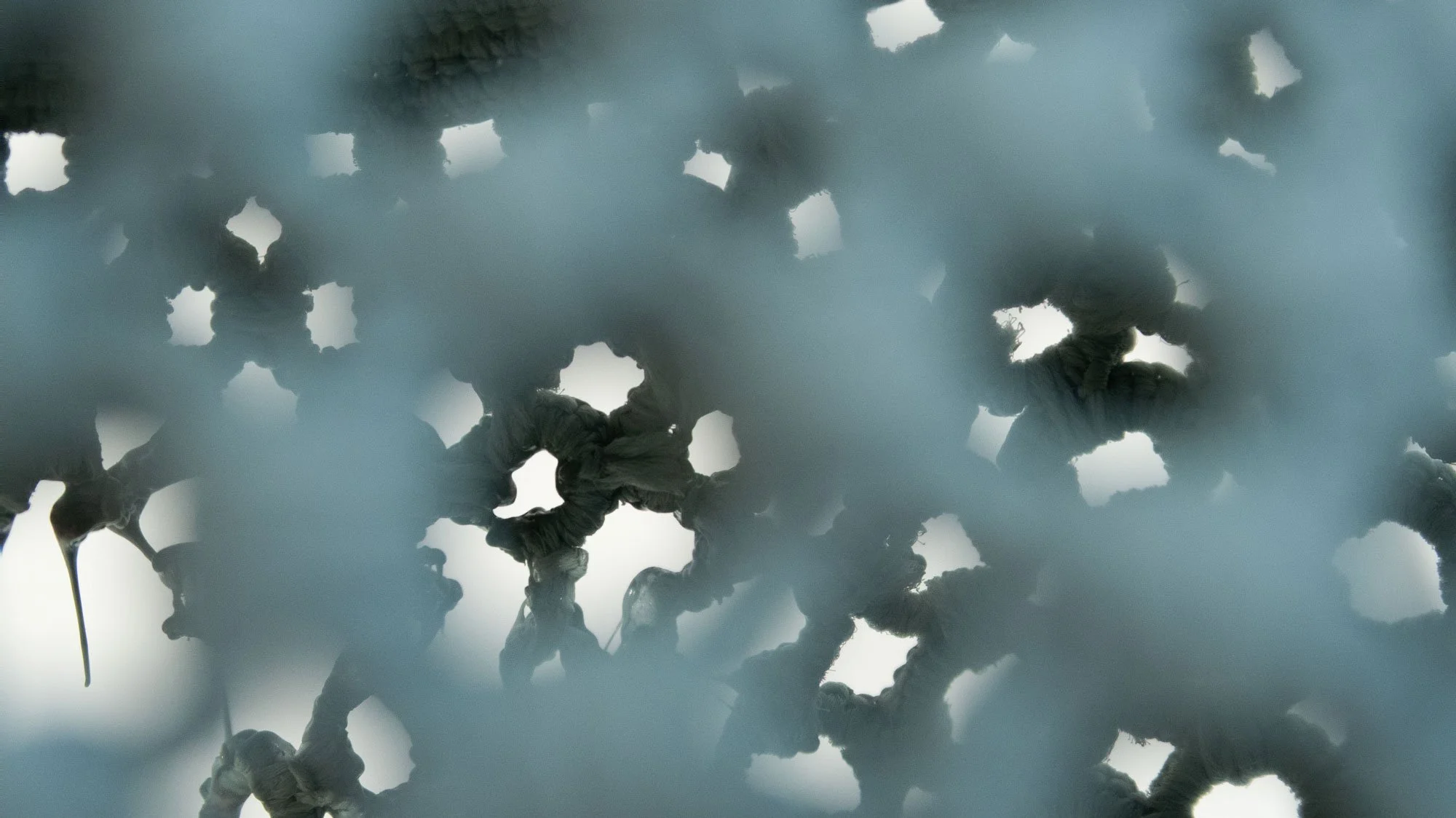 Crocheted and melted nylon, glass marbles, ramie