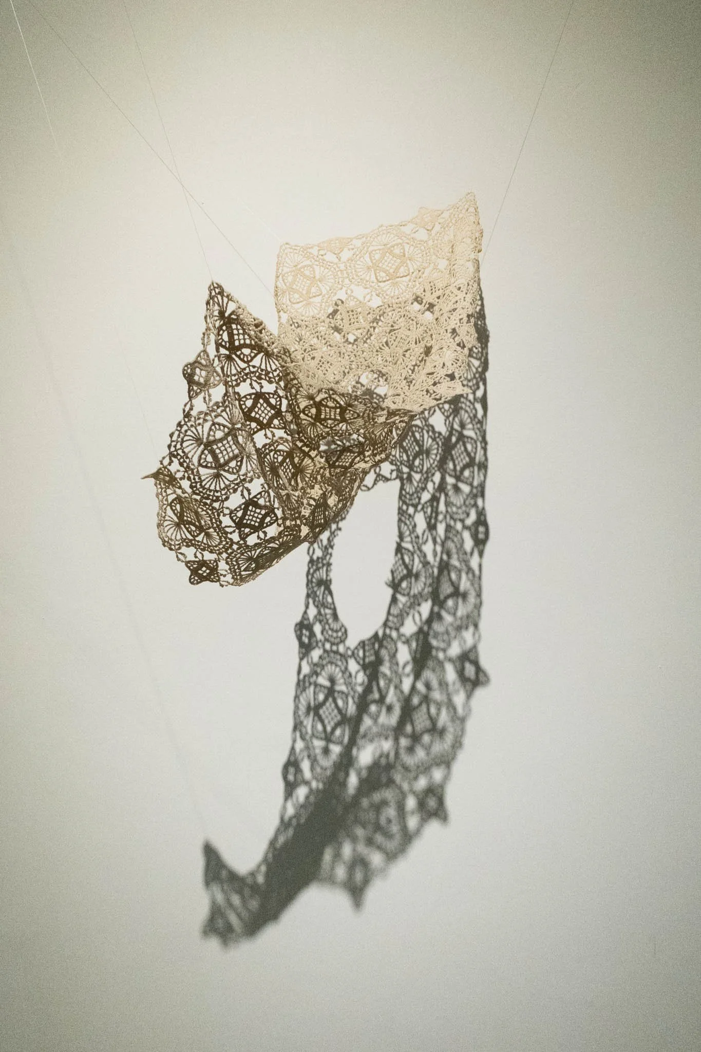 The artist’s recent exploration of vases in crochet prompts viewers to re-examine their idea of crochet as a ‘soft’ medium. Playing with the tension of the stitches, her crocheted vases are self-supported, silhouetted in structured lines. These vases are open-bottomed— revoking their identity as a ‘vessel’— and is each connected to a lace doily contrasted against its hard lines. In rendering these vases as completely ‘functionless’, the artist forces viewers to consider their perception of value in modern society.