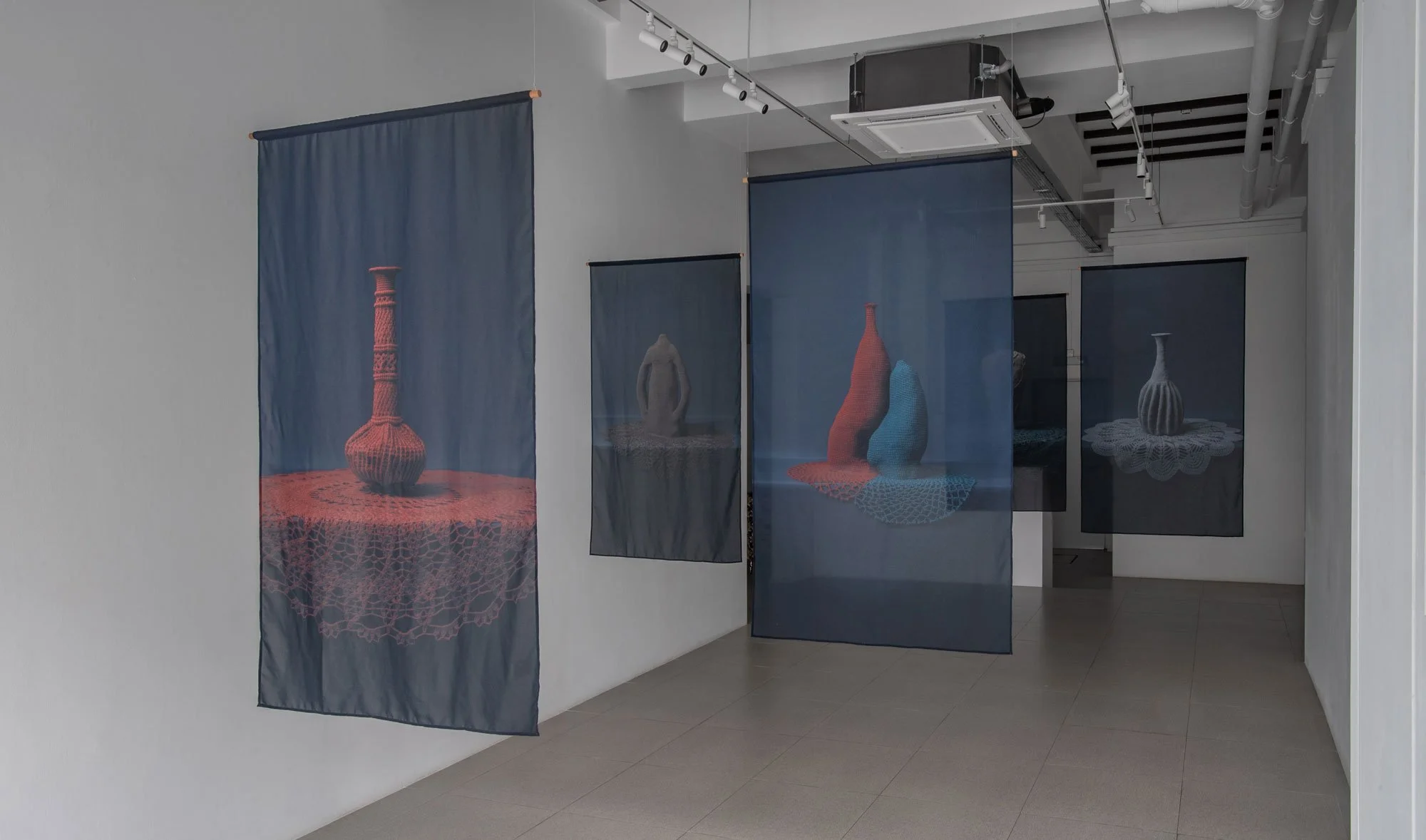Upon entering the gallery, visitors are greeted with 5 photographic prints of the crocheted vases on translucent fabric. Shot before the vases are irreversibly torched, these prints will not be reproduced again, representing a unique imprint of the vases’ ‘souls’ before they evolve into a different state.