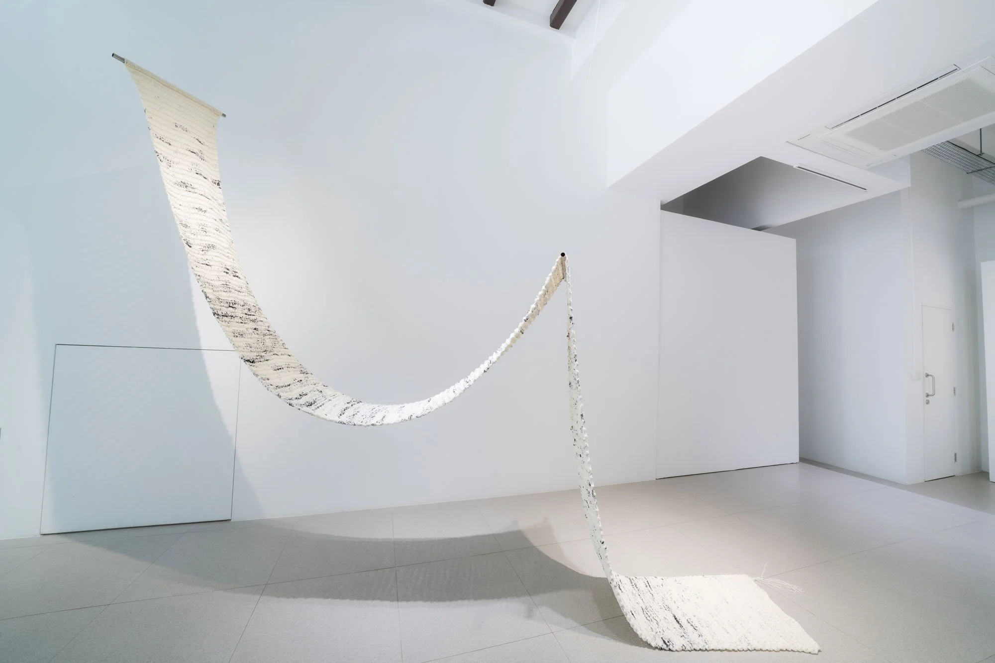 Watching the vases disintegrate, we can only anticipate what awaits us in the next space peeking from behind a mysterious curtain made up of the very yarn used to create the works.