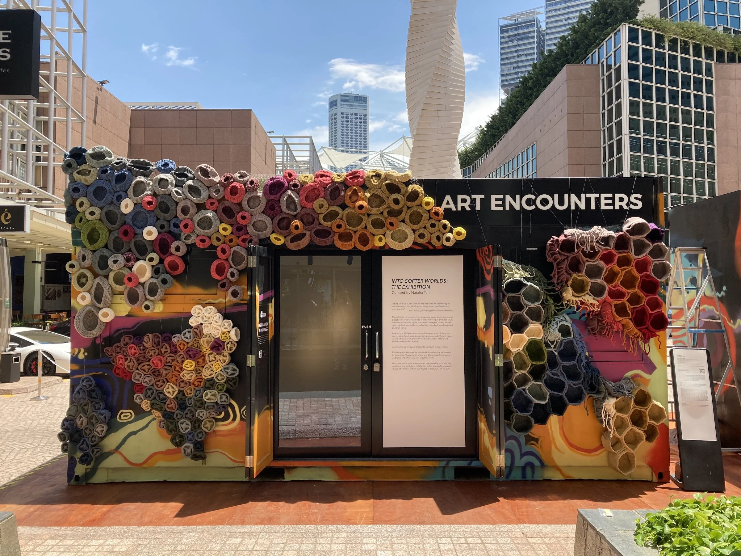 The second part of the installation grew over the progress of the exhibition as volunteers worked on another material— repurposed plastic! This included the leftover plastic from bubbletea seals, plastic bags from a hoard destined for the trash and red-and-white tape, to name a few. These materials were sourced from members of the public, which were then cut up then crocheted by another small army of 18 volunteers. While these might not withstand the weather conditions, they have given these plastics destined for the trash can a second life.