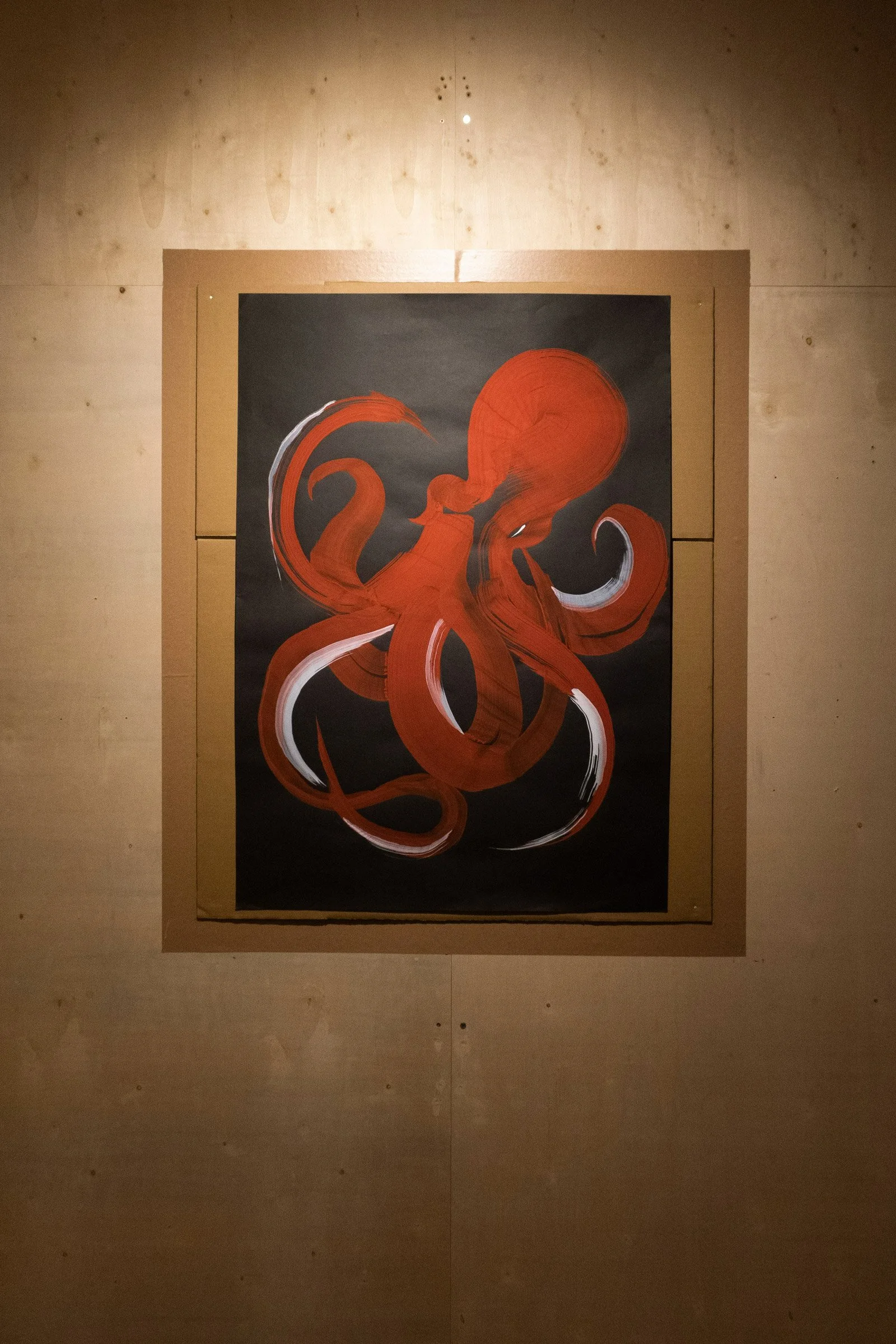 In Wu Yanrong’s painting, the eye is drawn immediately to each singular object centred within the confines of the paper edge. Yet, these sea creatures seemingly pulse with life through the ebb and flow of deliberate brushstrokes, holding an energy undeterred by the canvas framing them. The “box” thus serves only to “catch” them as we would catch a glimpse. This momentary gaze travels naturally from the dense coalescence of paint in a tight curve forming the octopus’s head in GUN, following the flick of each individual arm flaunting their dexterity, before landing on the menacing glint of the lively eye. The unrestrained spattering of dots on the fish in 1100 is a fleeting reflection of light on scales. In her creatures, reality is secondary; essence is paramount.
